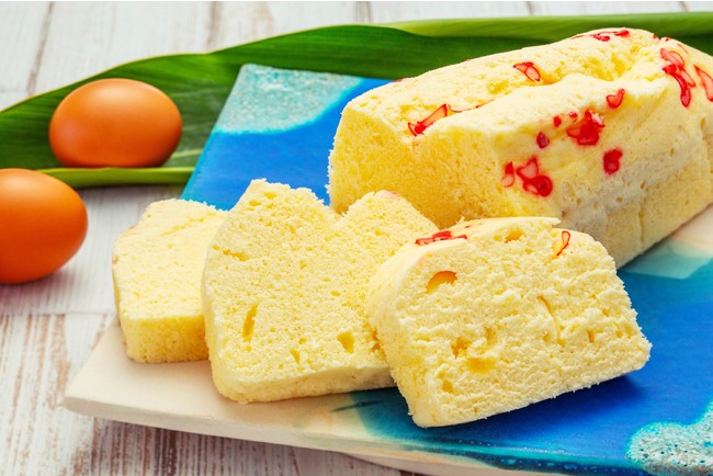 当時貴重だった鶏卵をふんだんに使用していることから、鶏卵を意味する「ちいるん」が名前につきました。落花生を赤く染色し、スライスしてちりばめた見た目が美しく、もっちりとした食感にふんわり柑橘系の香りがついた沖縄蒸しカステラです。