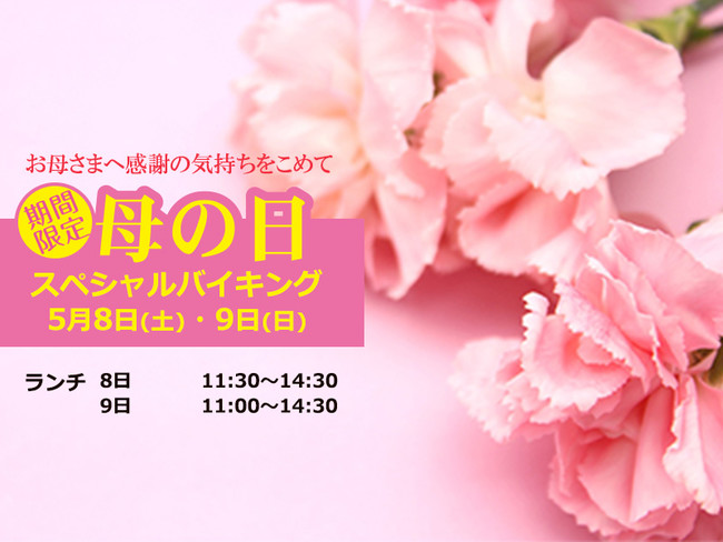 毎年大好評いただいています「母の日スペシャルバイキング」を本年は5月8日(土)~9日(日)にランチタイム限定で開催いたします。レストラン ボナペティの人気料理「ローストビーフ」、毎回好評の「握り寿司盛り合わせ」、お客様の目の前でシェフが調理しサービスするシェフズコーナーではじっくり煮込んだ豚肉を堪能できる「豚肩ロース肉と野菜の煮込み プロバンス風」などをご用意します。