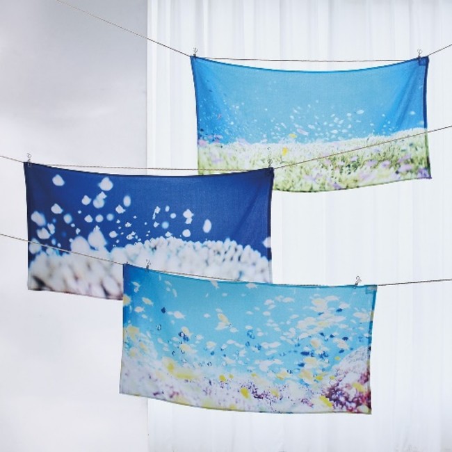 色彩あふれる水中写真をプリントしたガーゼとパイルの異素材バスタオルです。