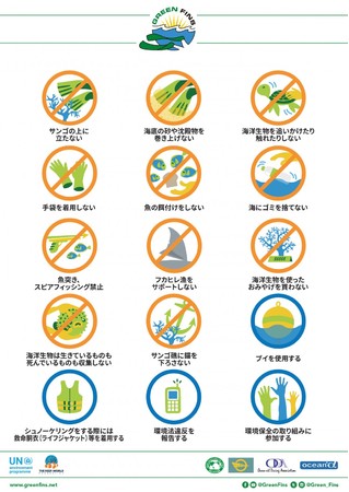 グリーン・フィンズとは、2004年に国連環境計画(UNEP)とイギリスのリーフワールド財団によりスタートした取り組みで、環境に配慮したダイビングやシュノーケリングのガイドラインを作成し、普及させていくことを通してサンゴ礁を保全することを目的としています。設立以来、世界11ヵ国・約600のダイビングショップが認定されています。