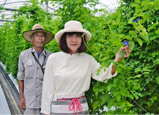 株式会社バタフライピー研究所は、沖縄県内各地でバタフライピーの栽培を行っております。沖縄市の契約農家で農業を営む屋宜文さんは「これまでは菊や桔梗を育てていたが、農薬を使用することから体への影響を心配しており、幼い孫もビニールハウスの中に入れることは控えていた。バタフライピーは完全無農薬で栽培しているので、子供や孫と一緒に収穫をしながら色の変化を楽しむなど自然体験につながっている」と話します。バタフライピーは軽くて収穫も簡単なことから、耕作放棄地の活用や障害者雇用にもつながります。沖縄の海を連想させる鮮やかな青色は観光客向けの加工食品としてもニーズが高まっており、沖縄県が抱える様々な問題を解決すると各方面から期待と注目を集めています。