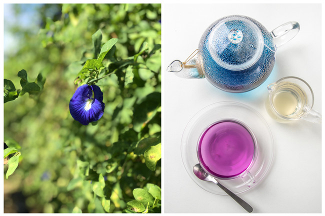年間を通して咲くその青い花が蝶の形に似ていることから、「バタフライピー」と呼ばれ、和名を「蝶豆(チョウマメ)」といいます。バタフライピーには抗酸化物質ポリフェノール「アントシアニン」が多く含まれており、その高い抗酸化作用からアンチエイジング効果が期待されています。この他にも、血液循環を向上させる機能により、眼精疲労の予防や、メタボリックシンドロームの予防効果が注目されています。 花弁から抽出されるバタフライピー液は神秘的な蒼色をしており、レモンなどの酸性と混ざることで魔法のように紫色に変化します。