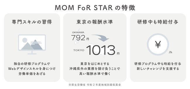 MOM FoR STARは、沖縄のシングルマザーのためのWebデザイン就業・協働プロジェクトです。デジタルデザイン企業と支援団体との連携により、未経験からスキルを習得し、Web業界で活躍できるまでをサポートします。シングルマザーのスキルアップ・キャリアアップを支援し、経済的な安定と、やりがいを持って働ける環境の実現を目指します。2021年4月からプロジェクトを開始し、現在は1期生の5名が活動しています。
