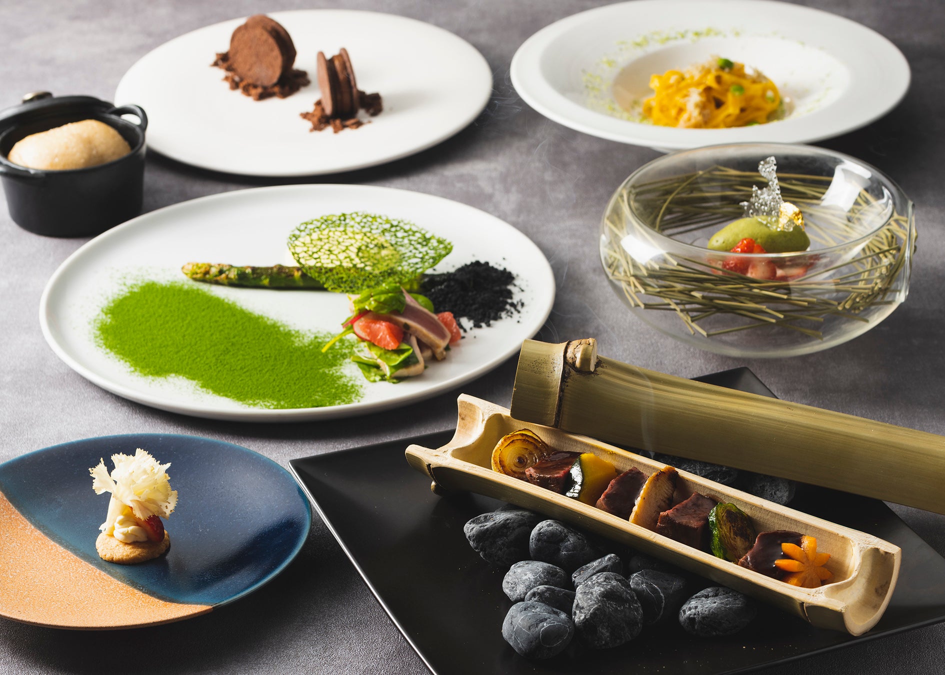 本ランチコースは、食材の良さを引き出すことで五感を刺激するという知名シェフの料理コンセプト「直感的に伝わる美味しさ」を基盤に、7つの料理で構成されています。そのこだわりと見た目の華やかさから、一皿一皿がアートのような印象を与えます。メインはお肉とお魚の2種類から選ぶことができ、低温調理で柔らかく仕上げた「牛フィレ肉の瞬間スモーク」(※2)は、ローズマリーのスモークの豊かな香りを纏うことでお肉の旨味が一層引き立ちます。また、真鯛のふわりとした食感を生かした「真鯛のソテー 山菜のサラダ」(※3)は、島らっきょうやアセロラなど沖縄を代表する食材が加わり、蛤のエッセンスで作られた味わい深いフォームが全体を優しくまとめあげる逸品となっています。