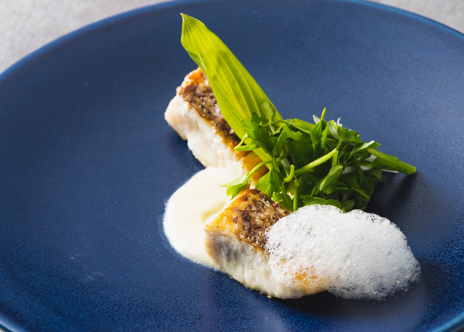 ・真鯛のソテー 山菜のサラダ ベルモット酒のソース 蛤の泡を添えて