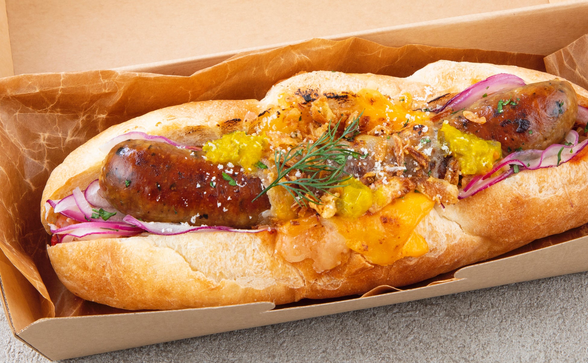 キビまる豚のすね肉をドイツの郷土料理「アイスバイン」にアレンジ。コラーゲンたっぷりの豚肉は、トロトロした食感なのにパンと合う新食感のホットドッグ!沖縄野菜の自家製レギュームブイヨンに白ワイン、ハーブなどでじっくり煮込んだ贅沢なデリです。