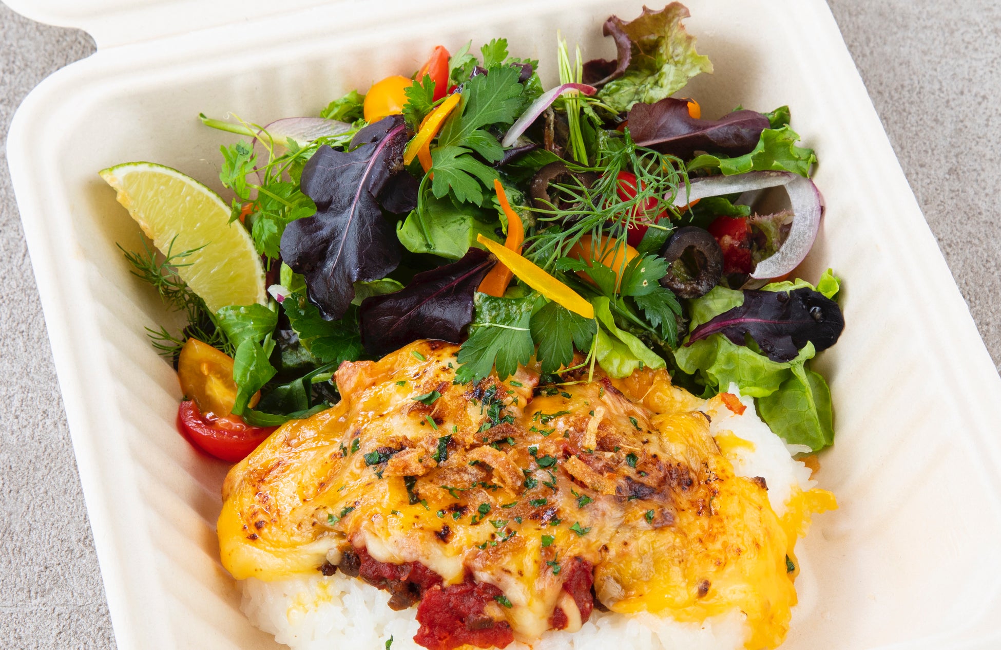 沖縄ソウルフードのタコライスを島デリ仕立てに。季節によって楽しめる数種類の沖縄野菜をたっぷり添えて、キビまる豚のミンチ、マンゴーチャツネ、香り高いバジルトマトソースで女性に人気の一品。