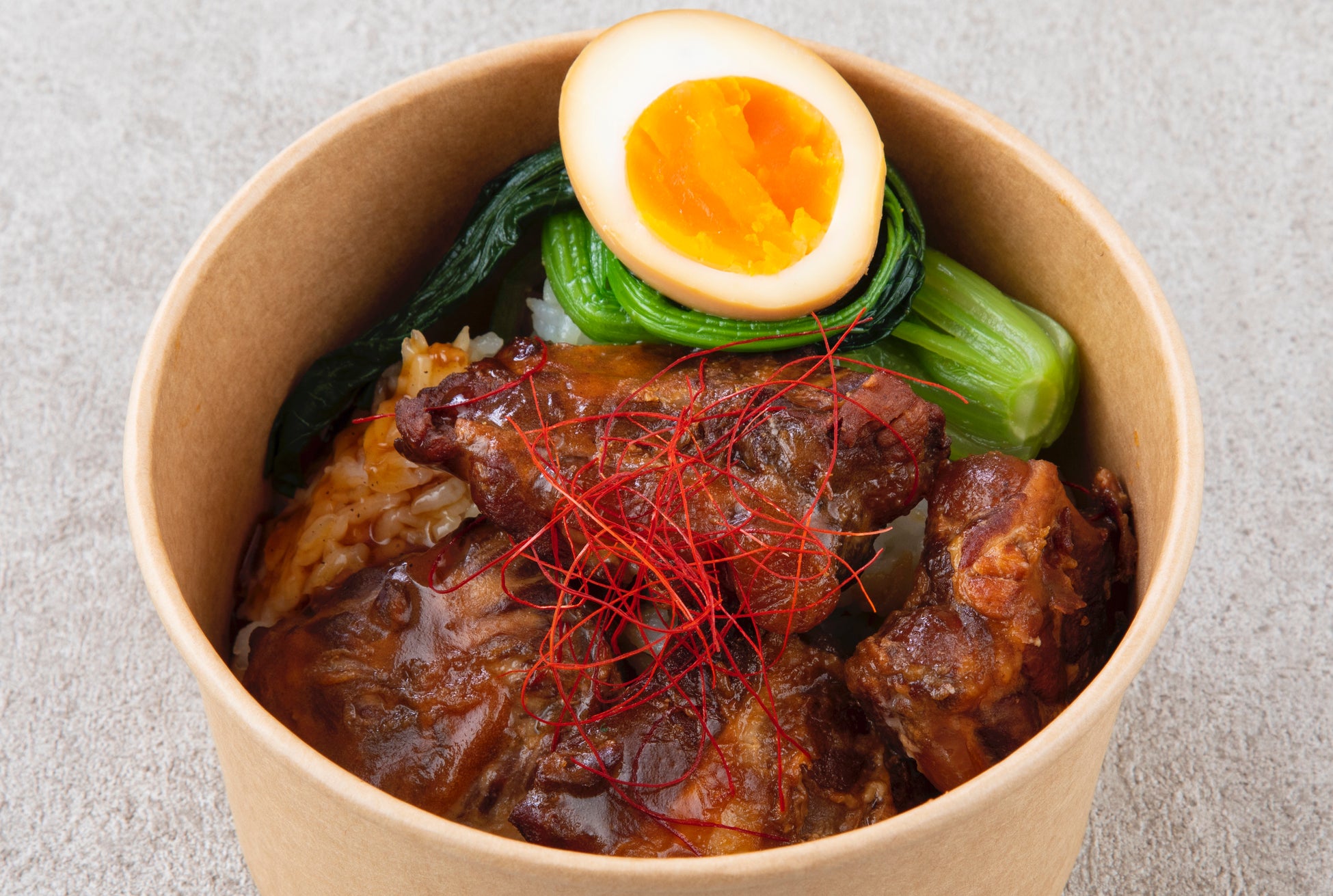 コラーゲンたっぷり!豚肉の軟骨ソーキを紹興酒などでやわらかくトロトロに仕上げた中華風甘辛丼。鶏ガラベースの特製ソースがやみつきに。