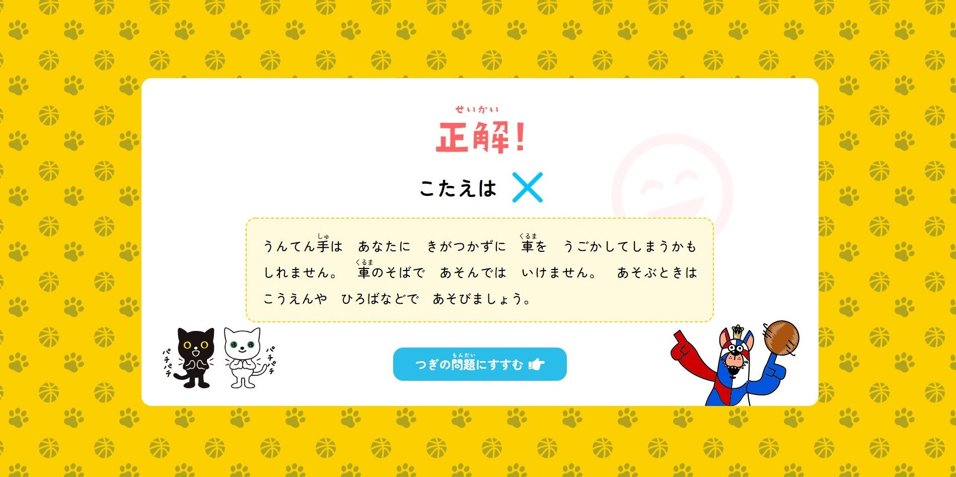答え合わせのページには交通安全に関する解説が掲載されており、「道路への飛び出しが危険である」こと、「車の運転手には死角がある」ことなど、より学びを深めてもらうことができます。
