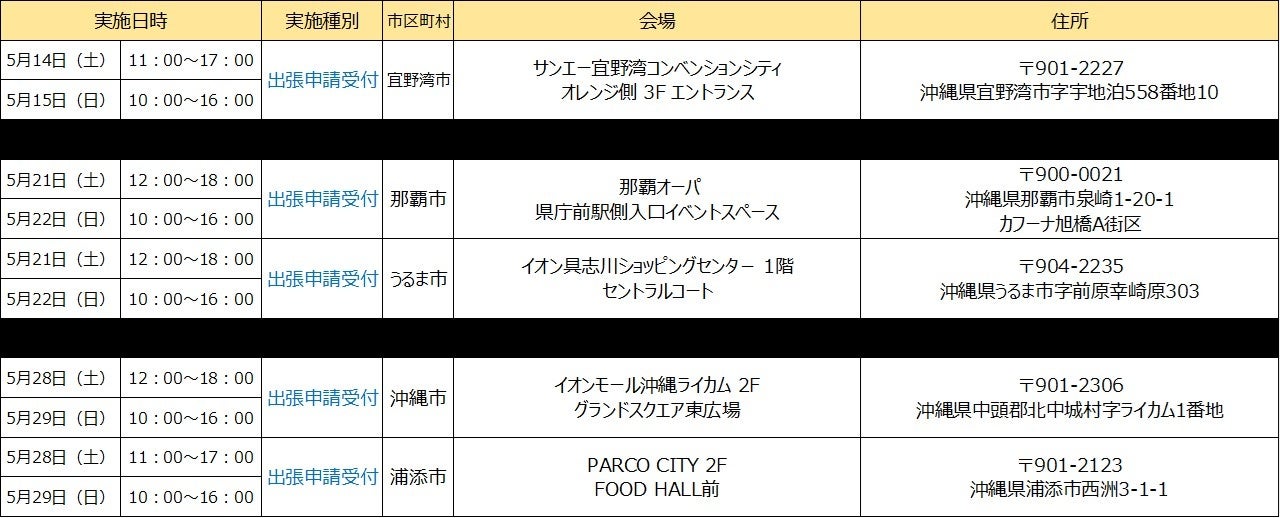※開催場所の調整状況や新型コロナウィルスの感染状況等により、「出張申請受付」及び「出張申請サポート」の開催を中止・延期、または実施内容が変更となる可能性がございます。