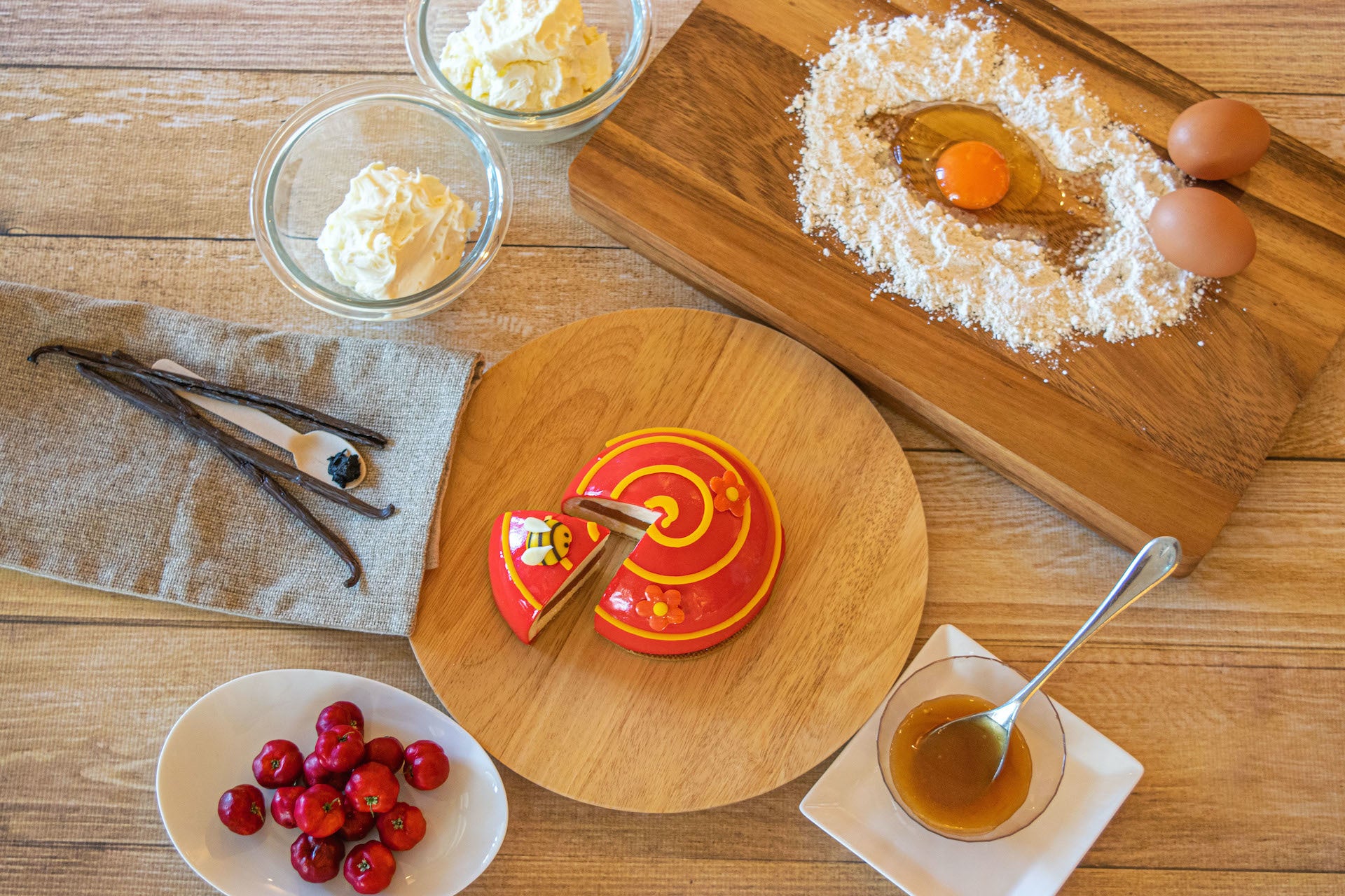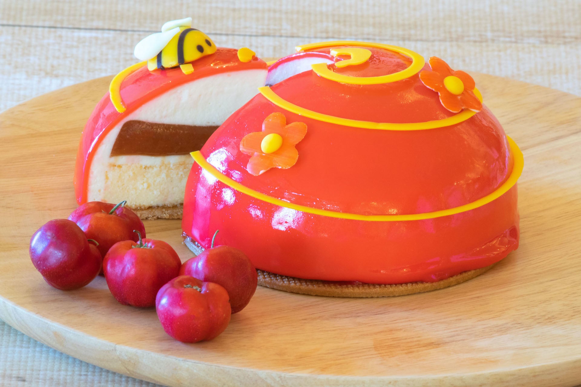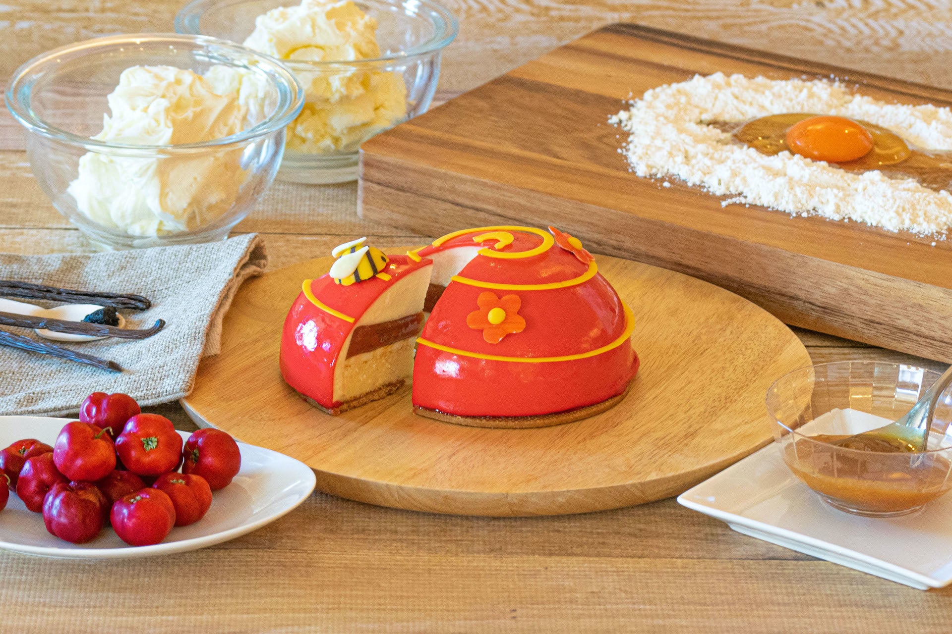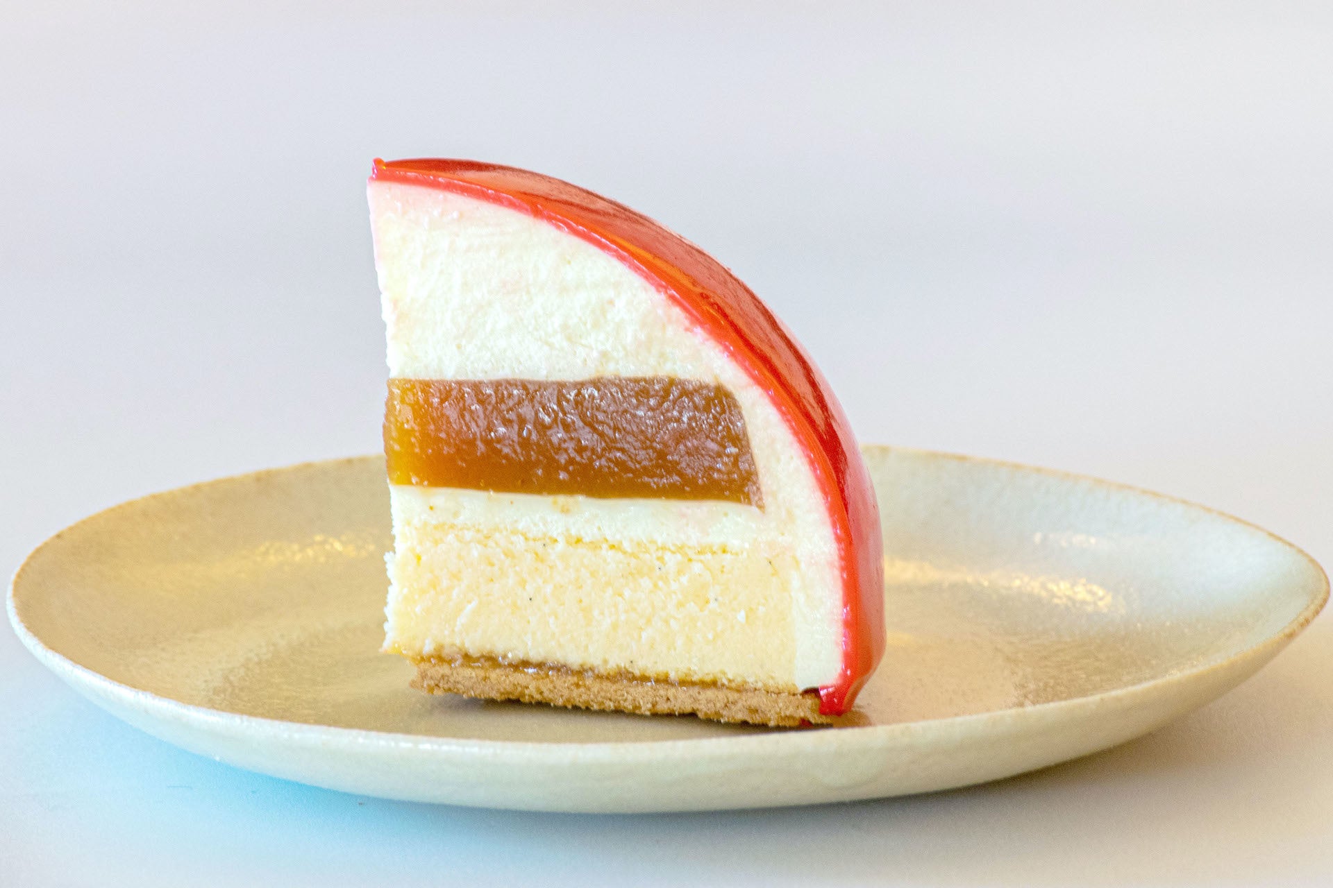 それぞれ単体で食べても美味しく味わえますが、アセローラジュレとチーズケーキ、はちみつムースを一緒に食べて一番美味しくなるようにつくりました。ぜひ三位一体の美味しさをお楽しみください。
