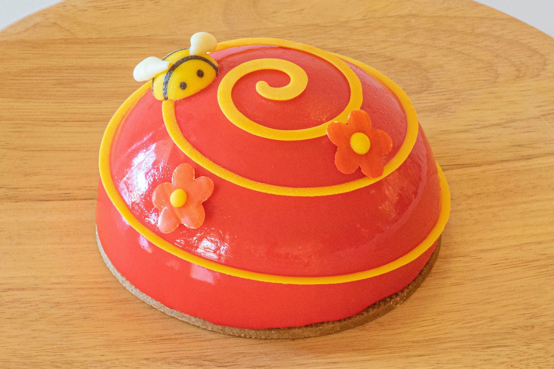 沖縄のもぎたてアセローラチーズケーキは本部町の山々に実るアセローラ畑で元気いっぱいのミツバチが遊んでいる様子をイメージしました。