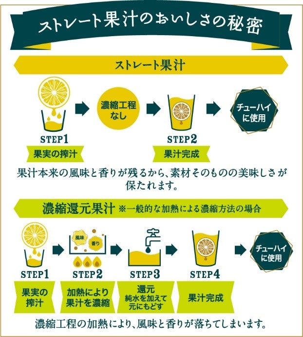 果実を搾ったまま加熱濃縮していない「ストレート果汁」を使用することにより、香料無添加で果実そのままの香りと風味を引き出しています。そのため、一口飲んだ瞬間の、まるでもぎたてのような瑞々しい果実の香りがお楽しみいただけます。