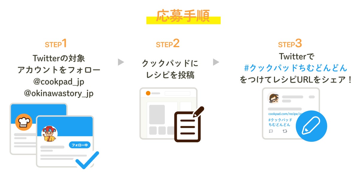 ・応募方法:クックパッド公式Twitter(@cookpad_jp)およびOCVB公式Twitter「マハエちゃんのおきなわ物語」(@okinawastory_jp)をフォローし、料理レシピサービス「クックパッド」にレシピを投稿する。その後、Twitterで「#クックパッドちむどんどん」をつけてレシピURLをシェアする