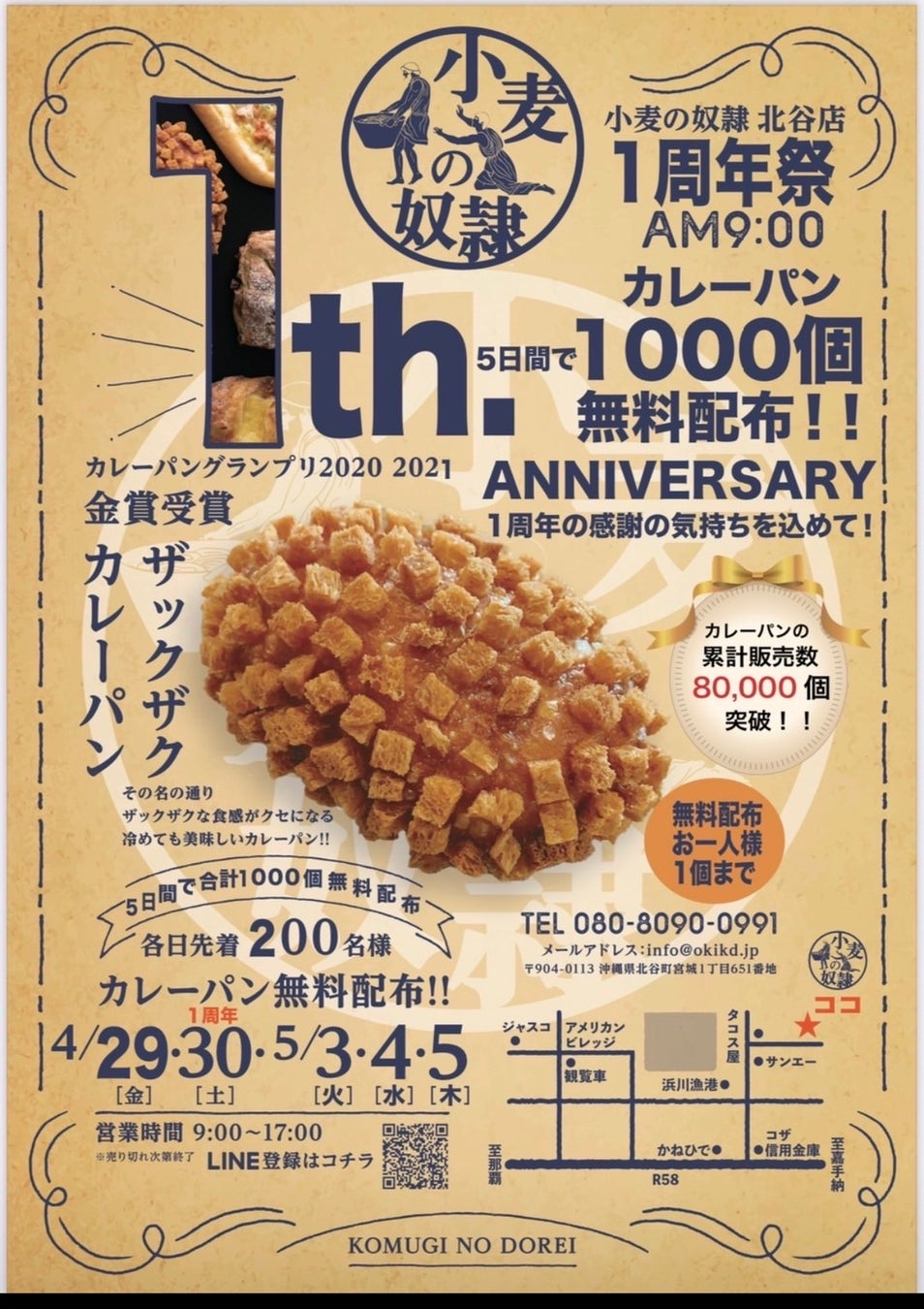 【4月29・30日、5月3日~5日の5日間、各日先着200名様】「ザックザクカレーパン」1000個無料配布!!【小麦の奴隷 沖縄北谷店】オープン1周年祭開催!