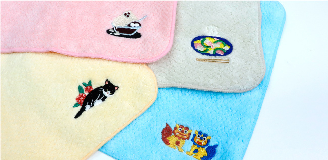 全9色展開のタオルハンカチに、【ちゅらさんぽ】ならではのモチーフを刺繍で表現。