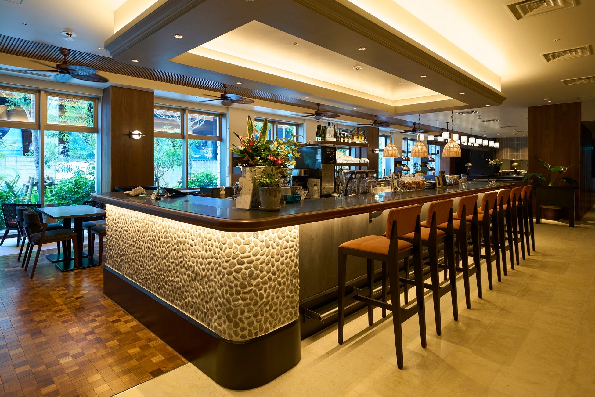 エントランスや館内には琉球石灰岩や花ブロック等、沖縄の伝統的な素材を随所に使用したほか、ロビー、レストランの一体設計と、外部の光を十分に取り入れた広々とした開口部を設けたことにより、街中のホテルでありながら、沖縄の吹き抜ける心地よい風の流れと光を感じられるくつろぎの空間を演出。また、最上階には、沖縄伝統「やちむん(焼き物)」の手洗い場がある天然鉱石人工温泉大浴場を備えており、旅の疲れが癒されます。