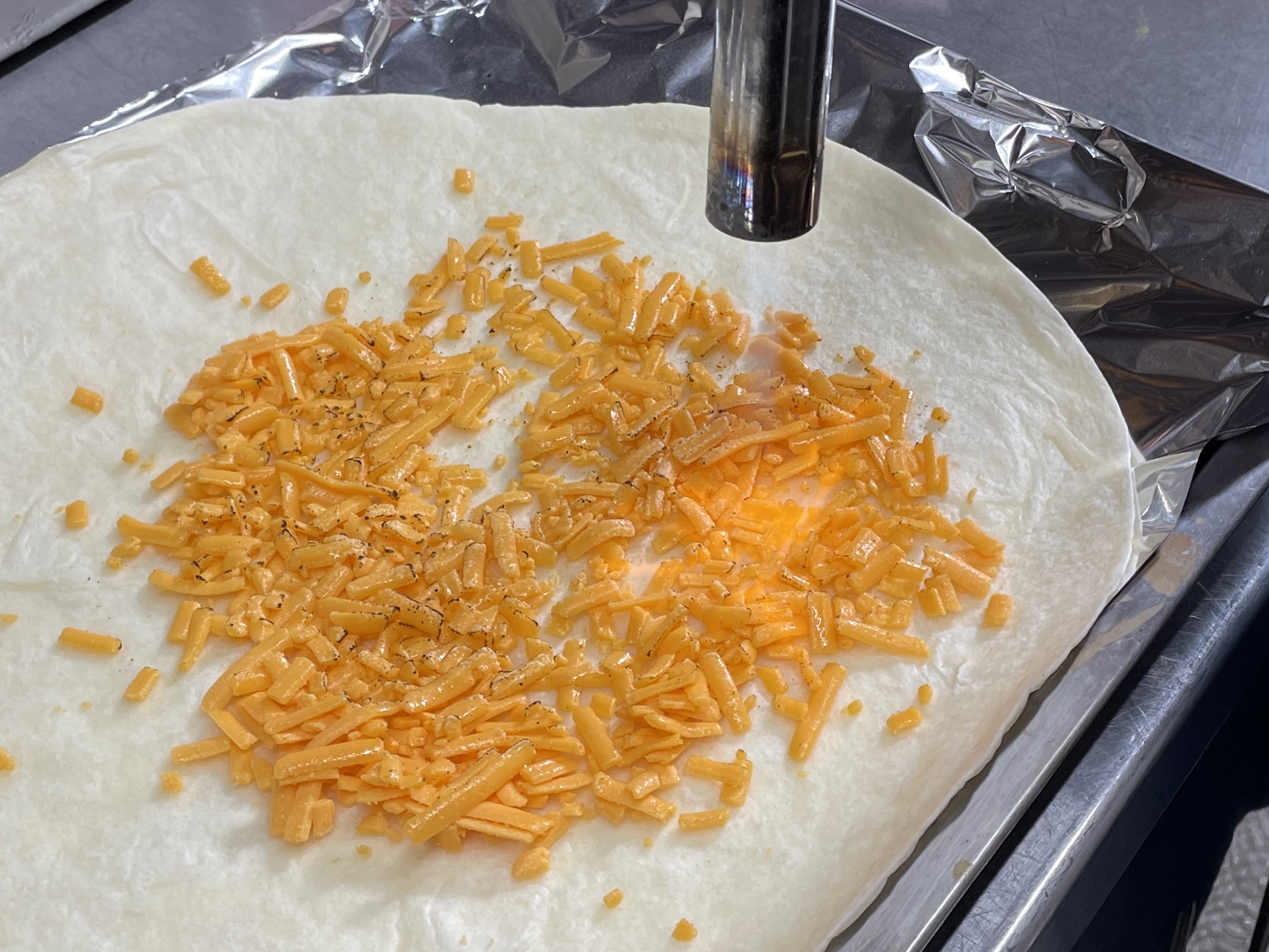まずは軽く熱を通したトルティーヤの上にチーズをたっぷりと。
