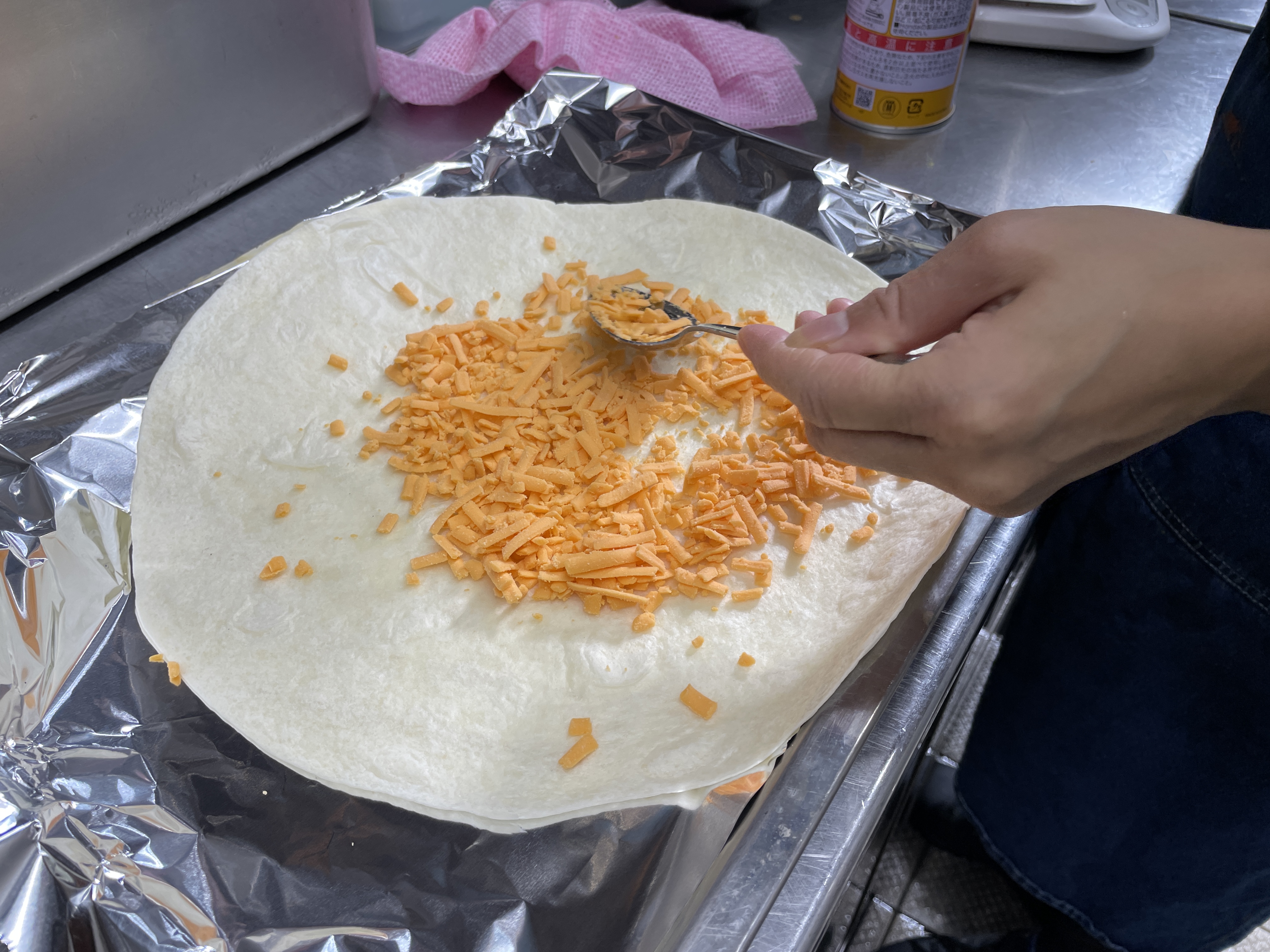 まずは軽く熱を通したトルティーヤの上にチーズをたっぷりと。