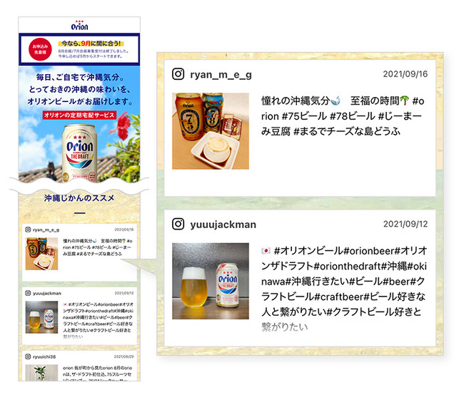 オリオンビールでは、2020年9月よりオリオンビール公式通販サイトにて、セレクトした商品を毎月お届けする定期宅配サービスを提供しています。この定期宅配サービスの購入者数拡大を目指し、広告出稿をはじめとする新規獲得向けの施策を展開する中で、広告単価の高騰に直面していました。定期顧客の新規獲得が難しくなる中で、沖縄旅行などの際にオリオンビールのファンから多くのSNS投稿を中心としたUGCが自然発生していることに着目し、このUGCを活用して定期宅配サービスのCVRを向上させられないかと考えていました。