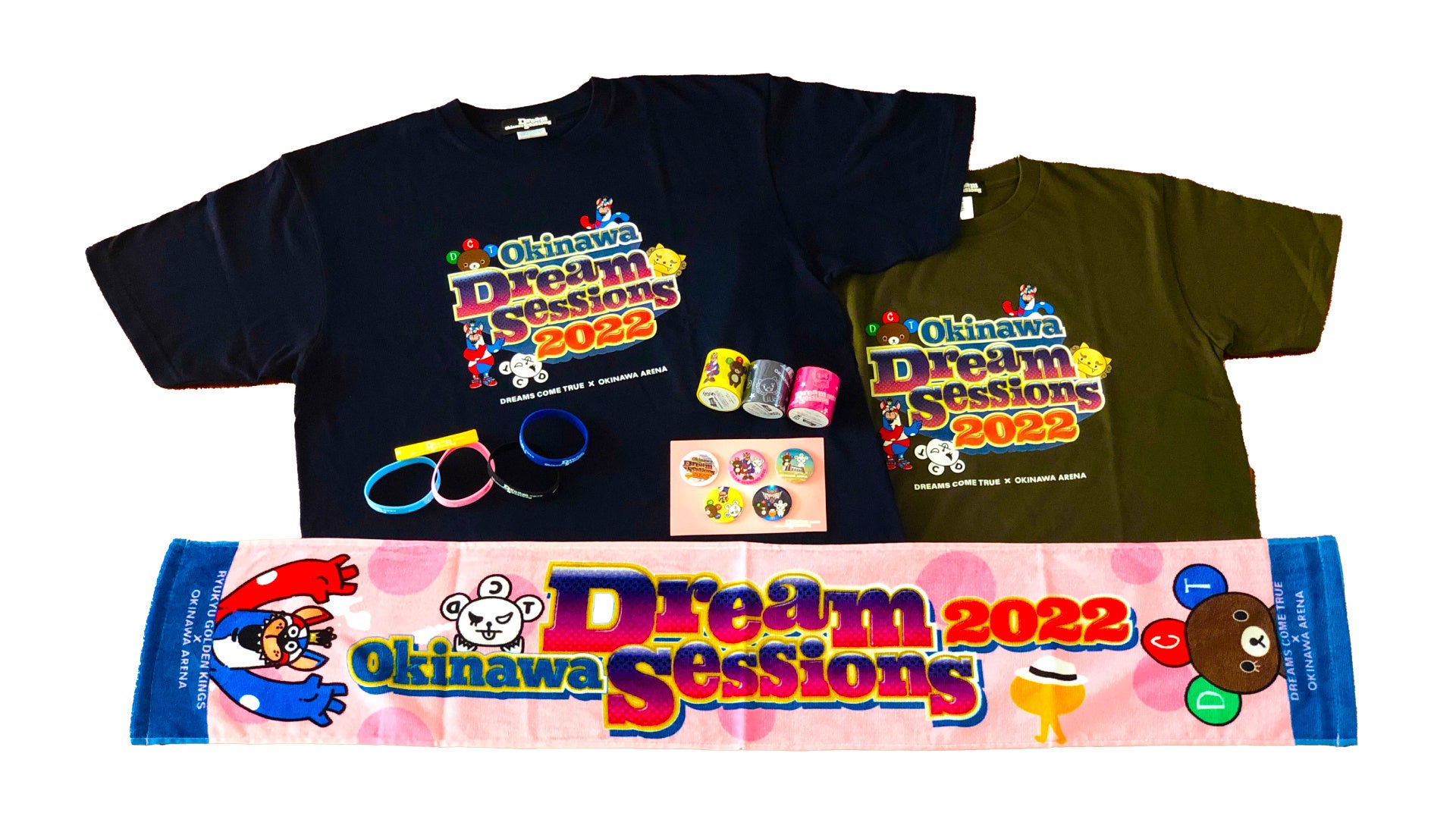 さらに、「Okinawa Dream Sessions 2022」のために、DREAMS COME TRUE、ナオト・インティライミの協力のもとで制作したイベントオリジナルのグッズが沖縄アリーナのアリーナ・ショップにて、5月1日(日)より販売開始となります。キャラクターがプリントされたTシャツ、タオル、雑貨など、とても可愛いグッズができましたので、是非ご覧ください。