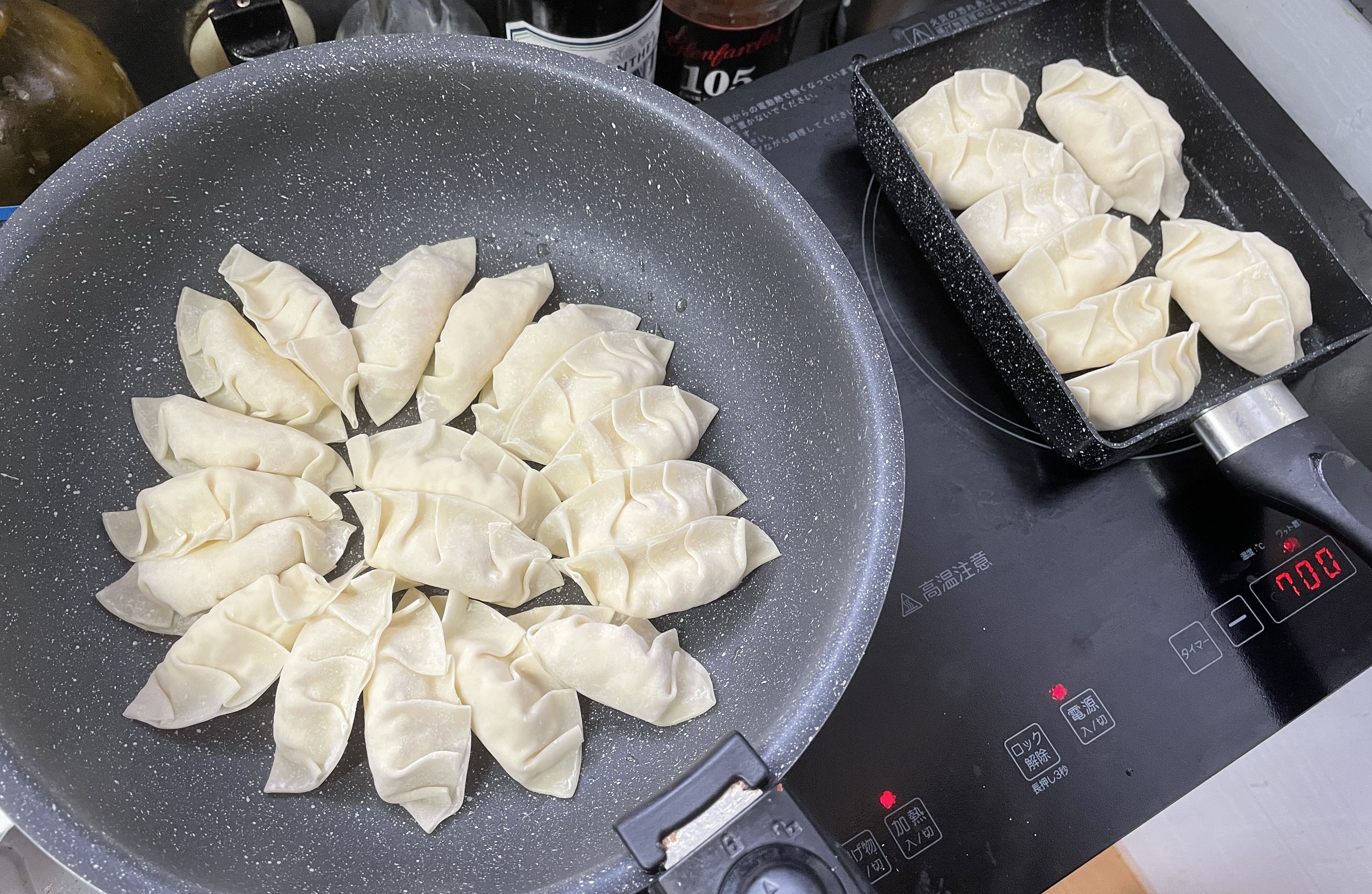 3.油をひいたフライパンに焼き目がつくまで中火にかけます。入りきらなかった分は普通に焼いて餃子のタレで食べてもGood!