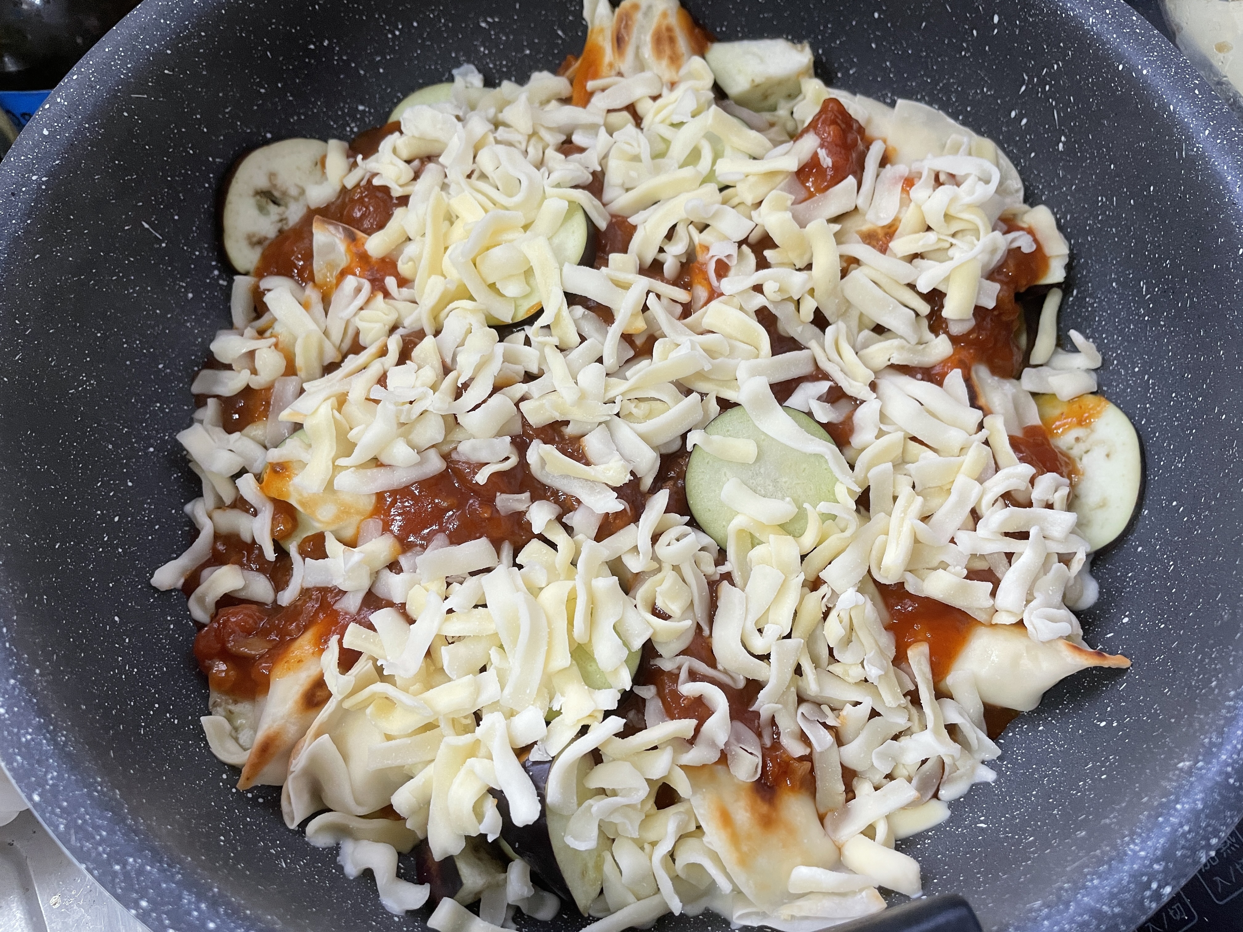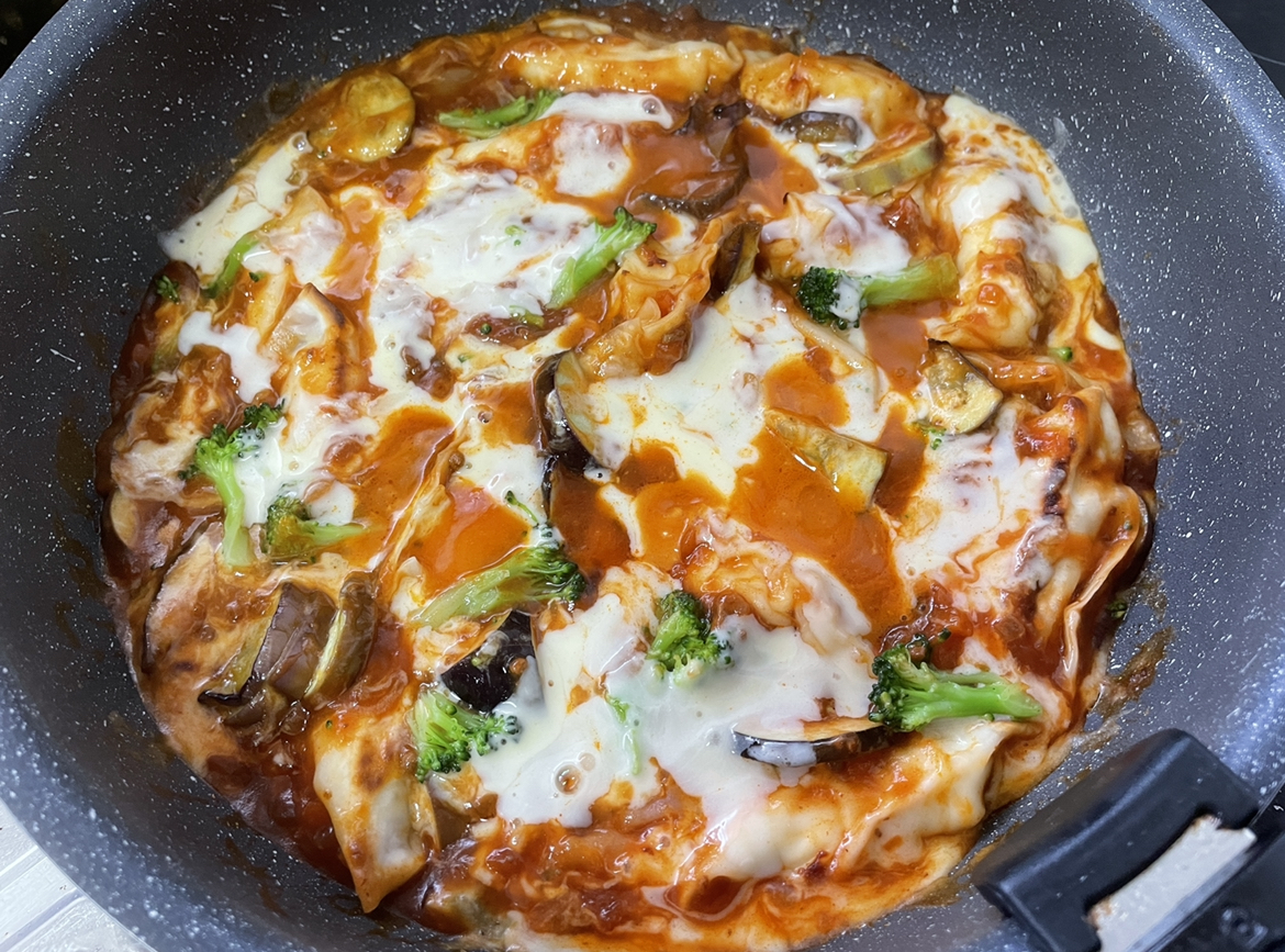 4.野菜とチーズを入れてさっくりまぜながら熱を入れていきます。餃子を潰さないように注意しましょう