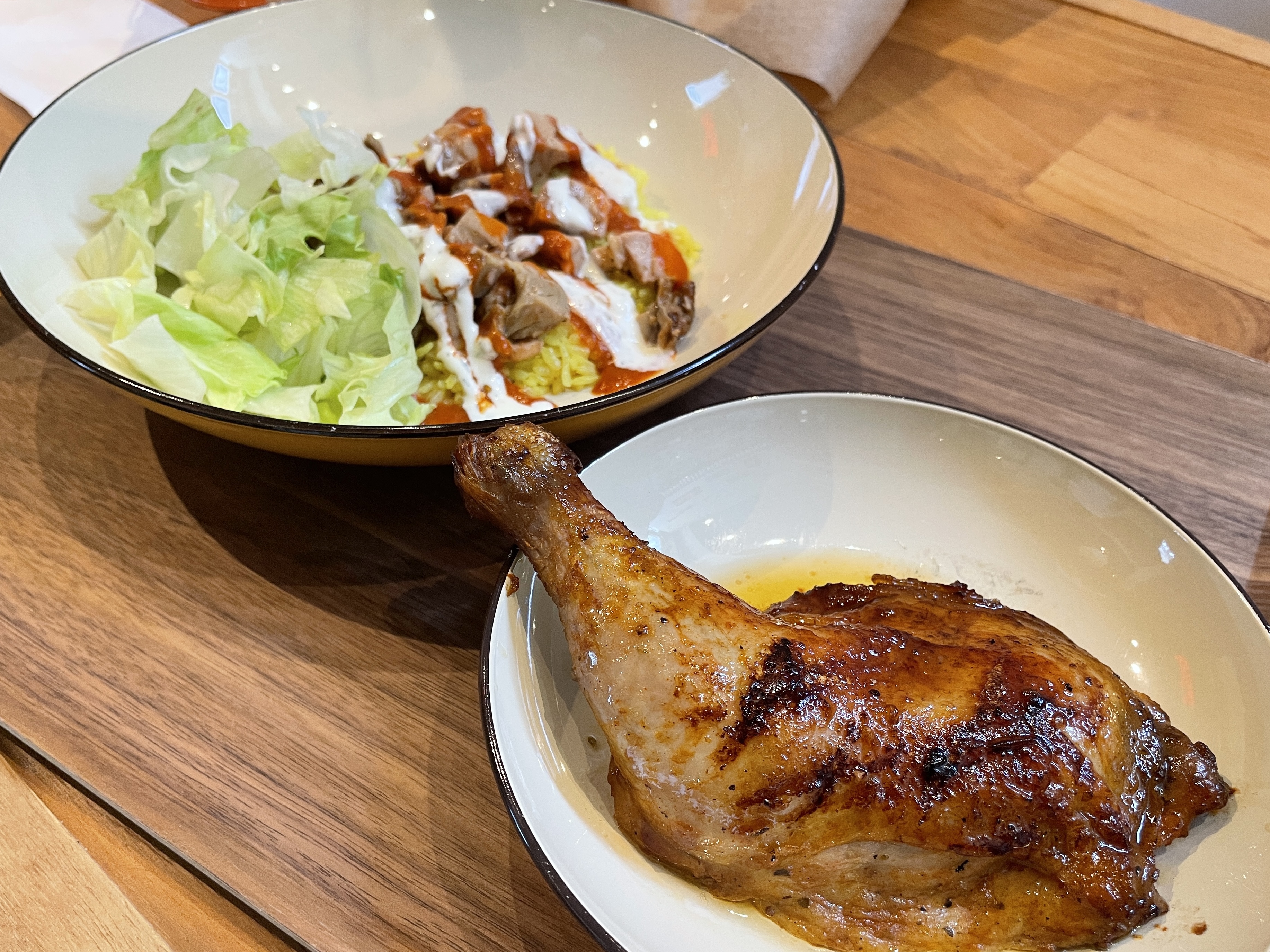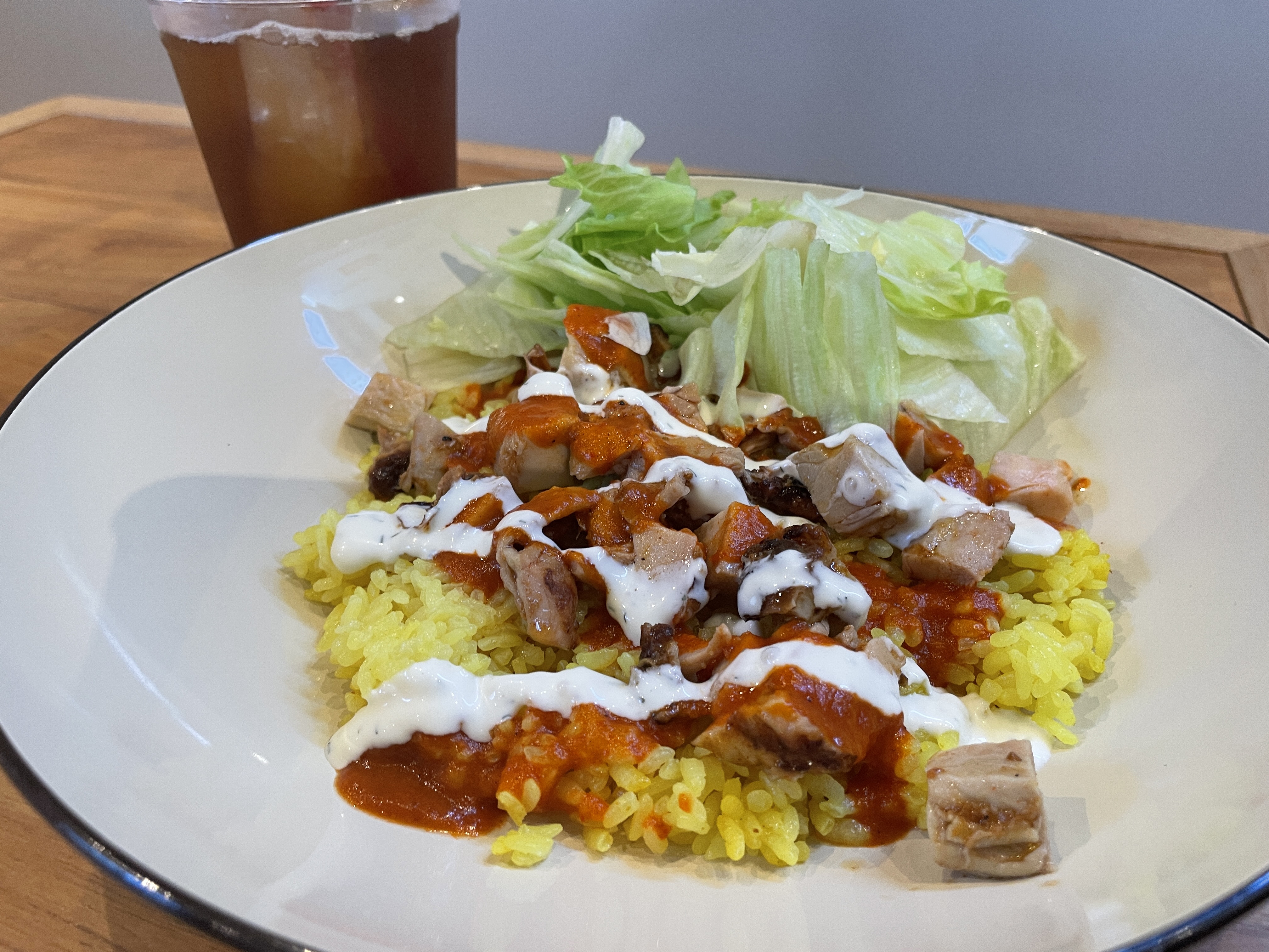 チキンオーバーライスならワンプレートで叶っちゃいます。トッピングでお野菜もつけられるのも嬉しいポイントです。